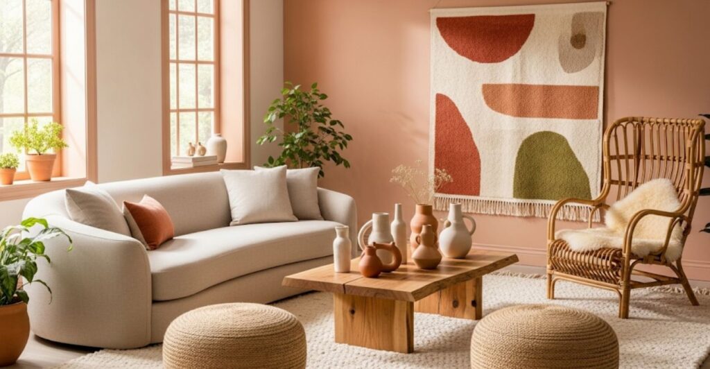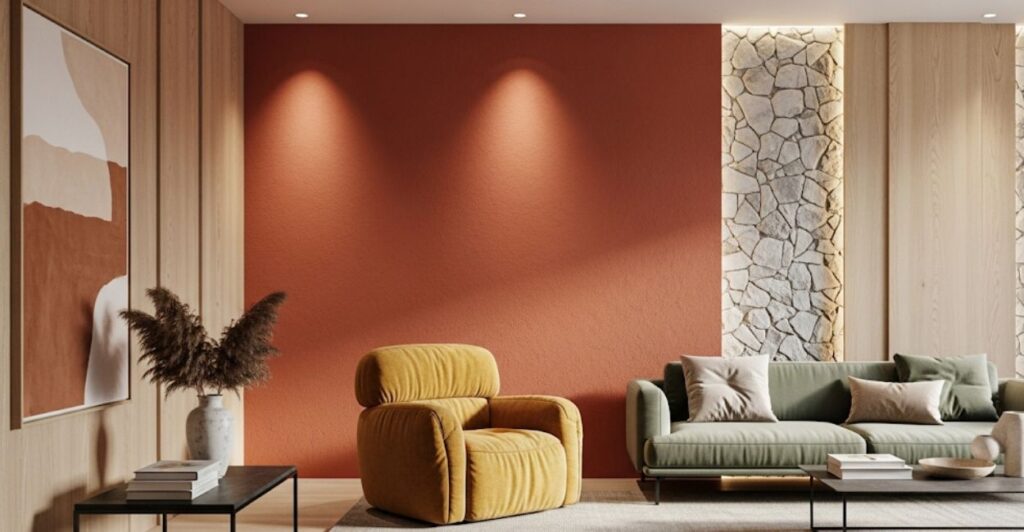 Comece com superfícies amplas: paredes em terracota suave criam imediatamente um convite caloroso. Para evitar monotonia, combine com revestimentos naturais como madeira clara ou pedra irregular. A cor atua como pano de fundo neutro, permitindo que móveis em tons contrastantes — verde-sálvia, azul-petróleo ou mostarda — ganhem destaque.
